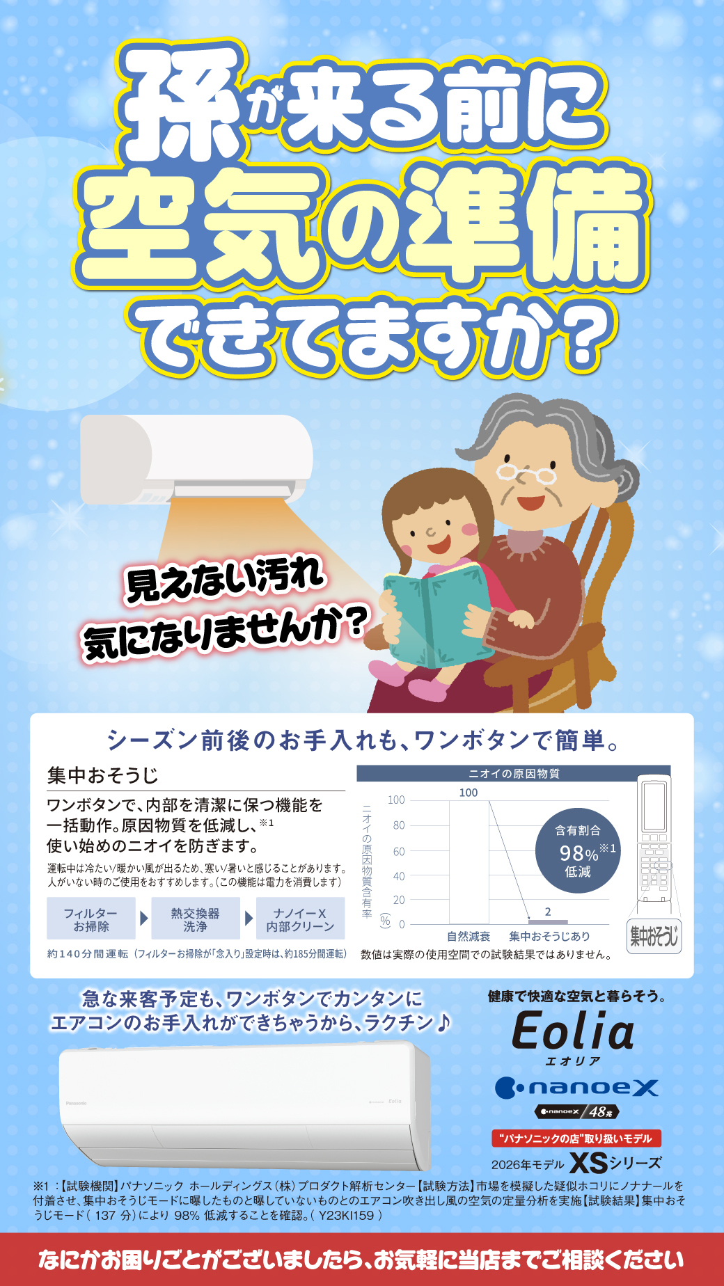 今年もエアコンの早期点検の受付が始まりました😄暑い夏に向けてエアコンの点検をしませんか?夏の繁忙期に故障してしまうと、お待たせしてしまうこともあるので1月、2月、3月の予約をオススメしています✨申込は2026年3月末まで。年式を問わずお申込みくださいね🤗✨